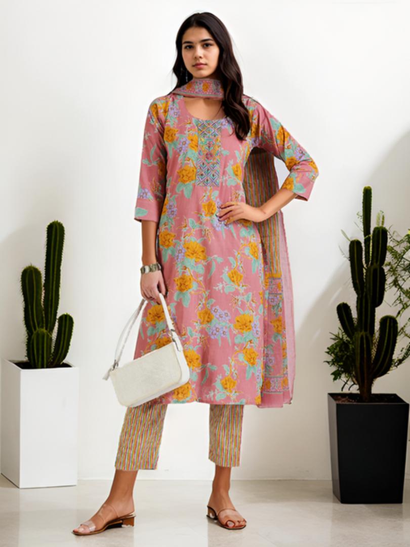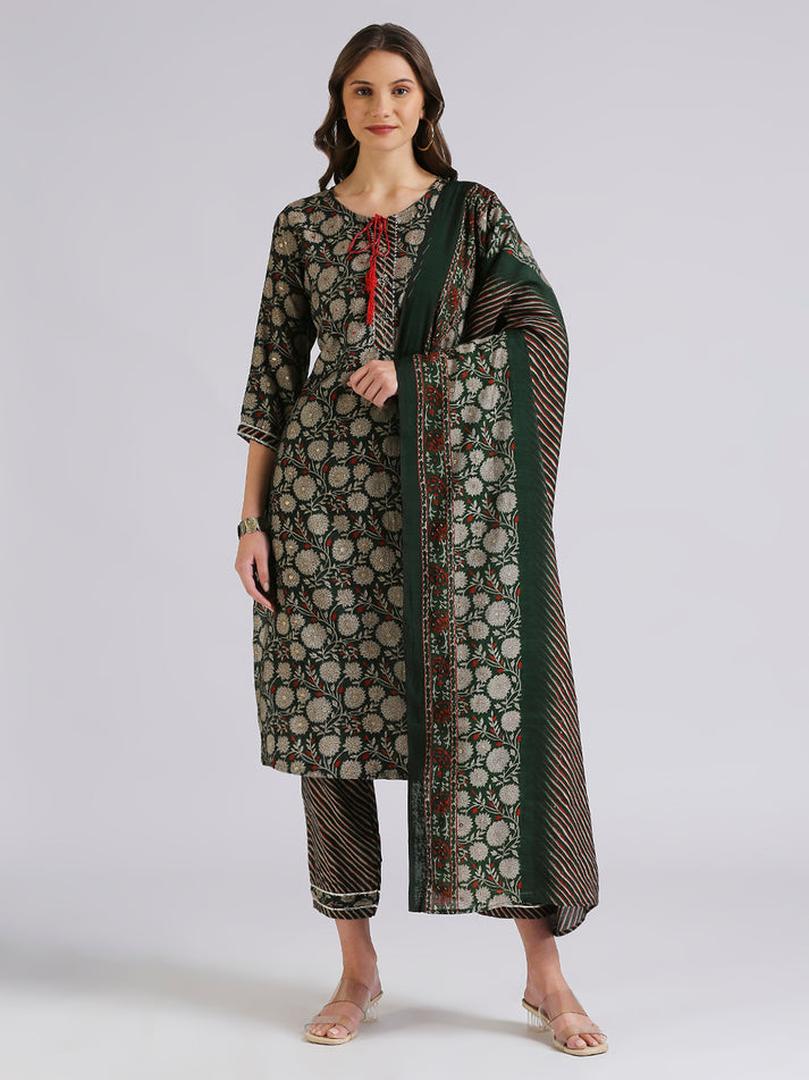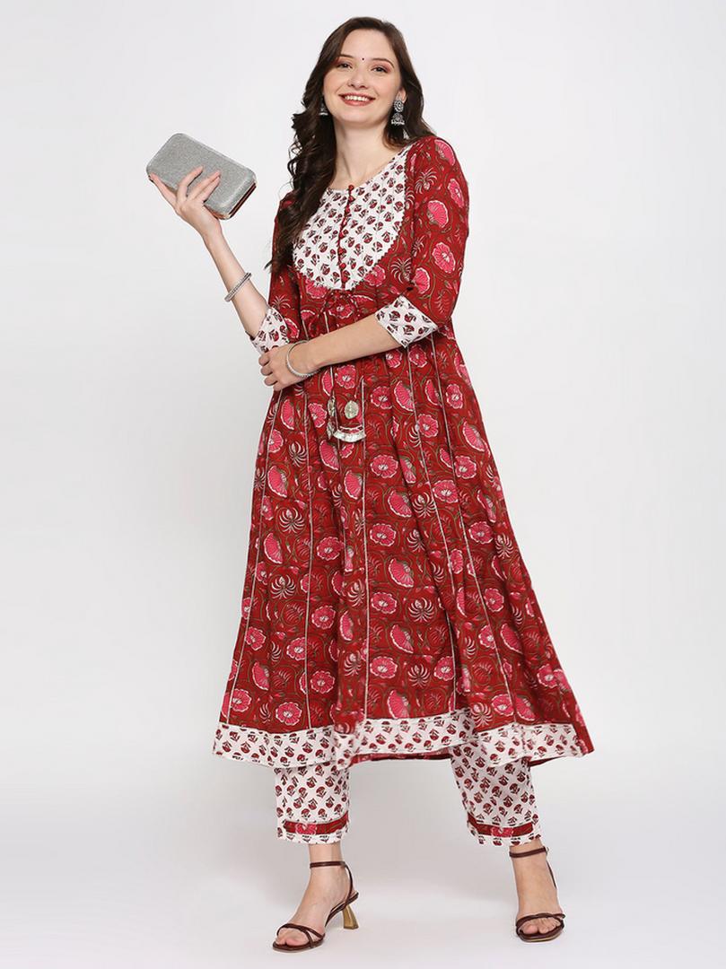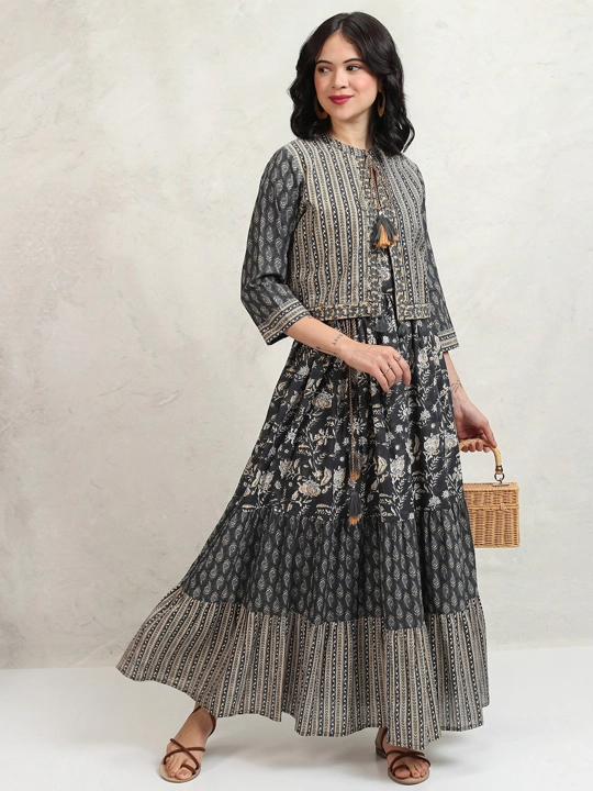 Vishudh Floral Printed Fit And Flare Maxi Ethnic Dress With Tie Up Shrugs