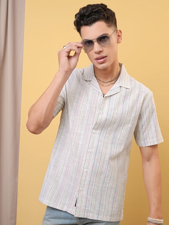 LOCOMOTIVE Men Striped Cuban Collar Shirt
